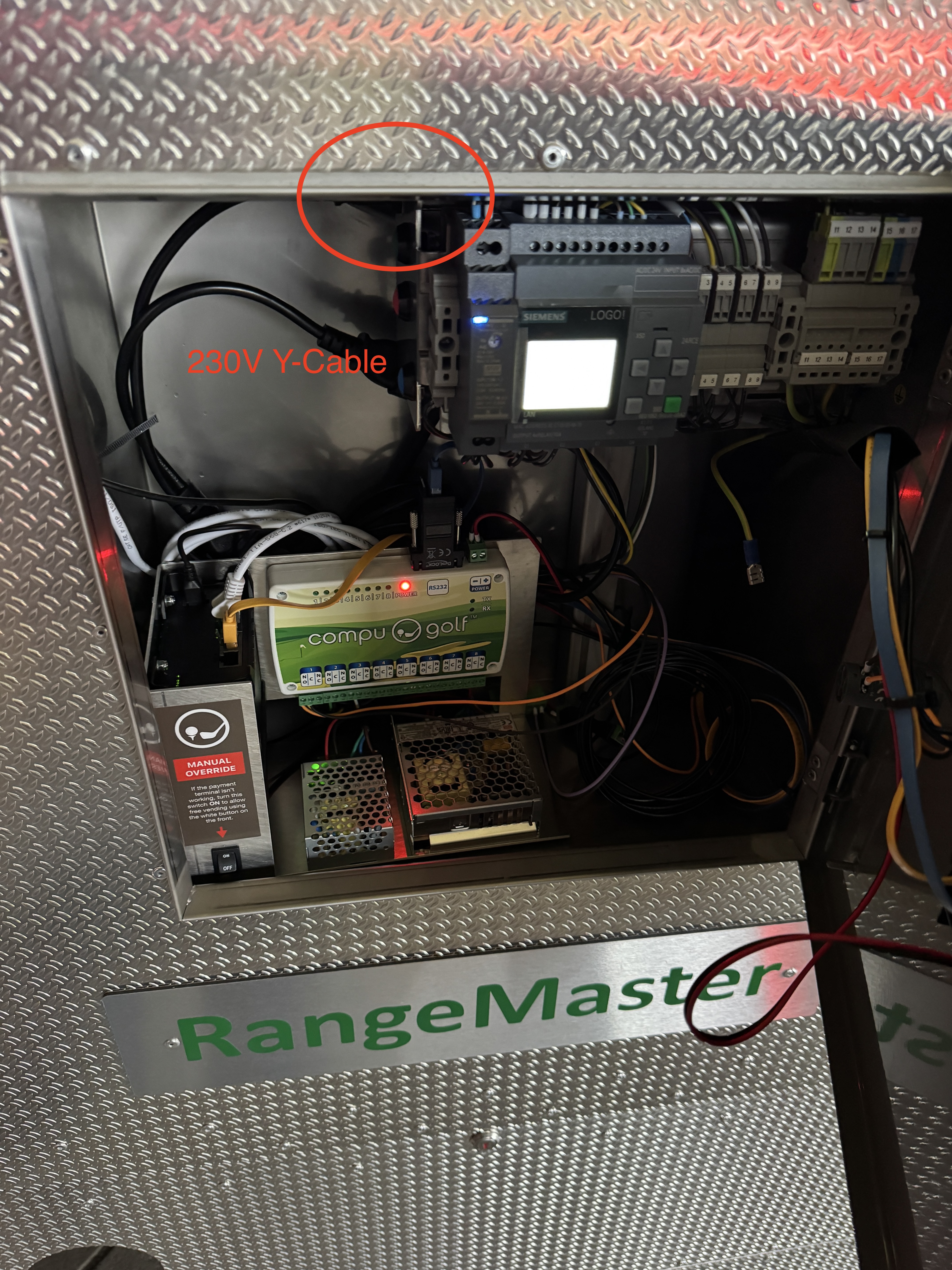 230V strøm tages ved hjælp af det medleverede Y-stik fra indgangen til PLC systemet øverst i venstre side.