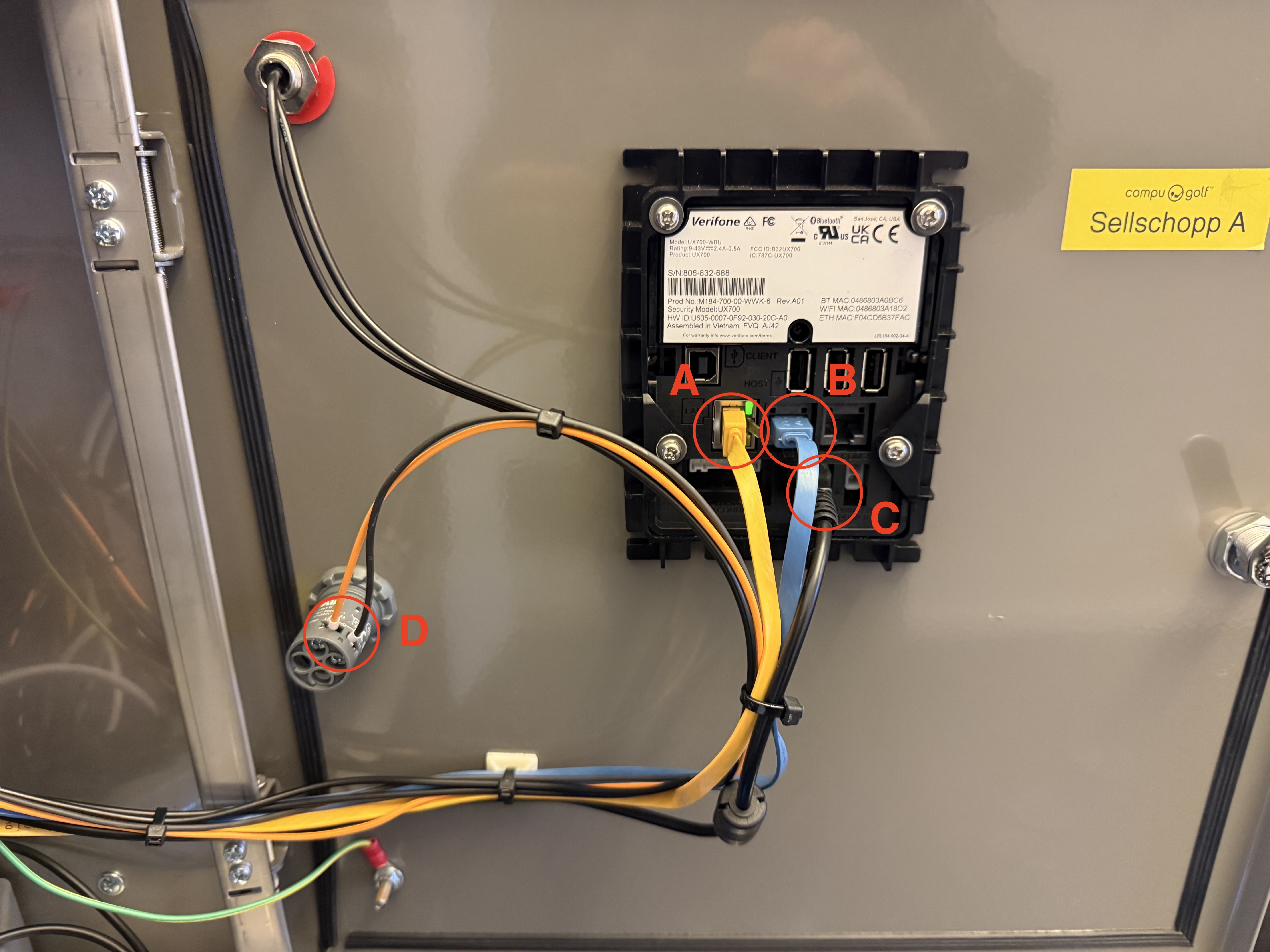 - Det gule LAN kabel fra elektroniksættet klikkes i LAN stikket på terminalen