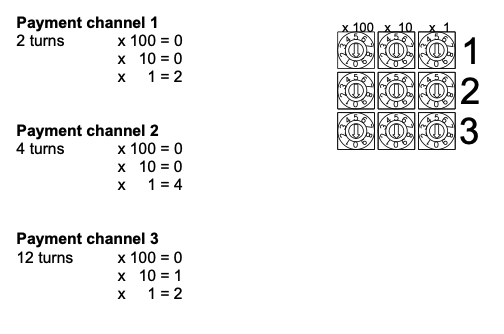 Herefter skal du kode kanalerne, så de nøjagtigt tilsvarer de produkter du har oprettet på betalingssystemet. F.eks. kanal 1 = 15 bolde, Kanal 2 = 30 bolde og Kanal 3 = 45 bolde og kanal 4= 60 bolde. Kanal 5 er koblet op som 'nødkanal' når du aktiverer den hvide knap på forsiden, og her kan du bestemme hvor mange bolde denne kanal skal give, f.eks. 30 bolde.